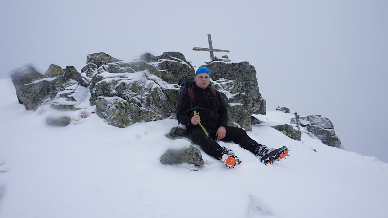 Dopada mnie bezradność, pora się wycofać . Chce iść dalej lecz nie umie. Podobno na Slavkovský štít dzieli mnie jakieś niecałe trzydzieści minut. Do tego cały Slavkovský jest w chmurach, a szlak pokryty jest zapadającym się śniegiem. Dodatku zaczyna padać śnieg. Zawracam, Można powiedzieć że Slavkovský zagrał mi na nosie.